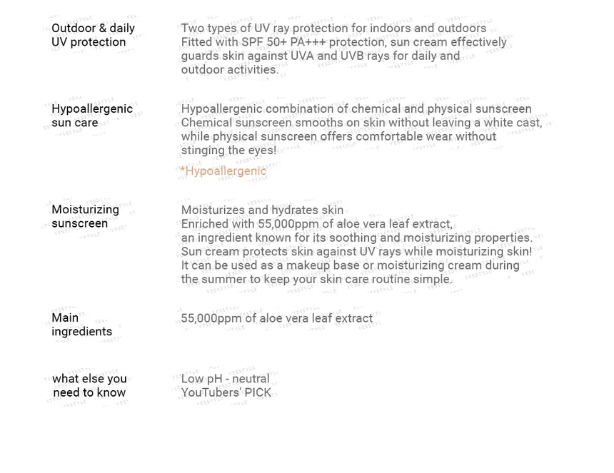 • This chemical and physical hybrid sunscreen offers sun protection of SPF50+ PA+++ along with hydrating and soothing benefits with ingredients like aloe leaf extract and glycerin. In a lightweight cream texture, the formula absorbs quickly into skin without leaving a greasy or white cast finish. The inorganic and organic sun cream can be used on the face and body.