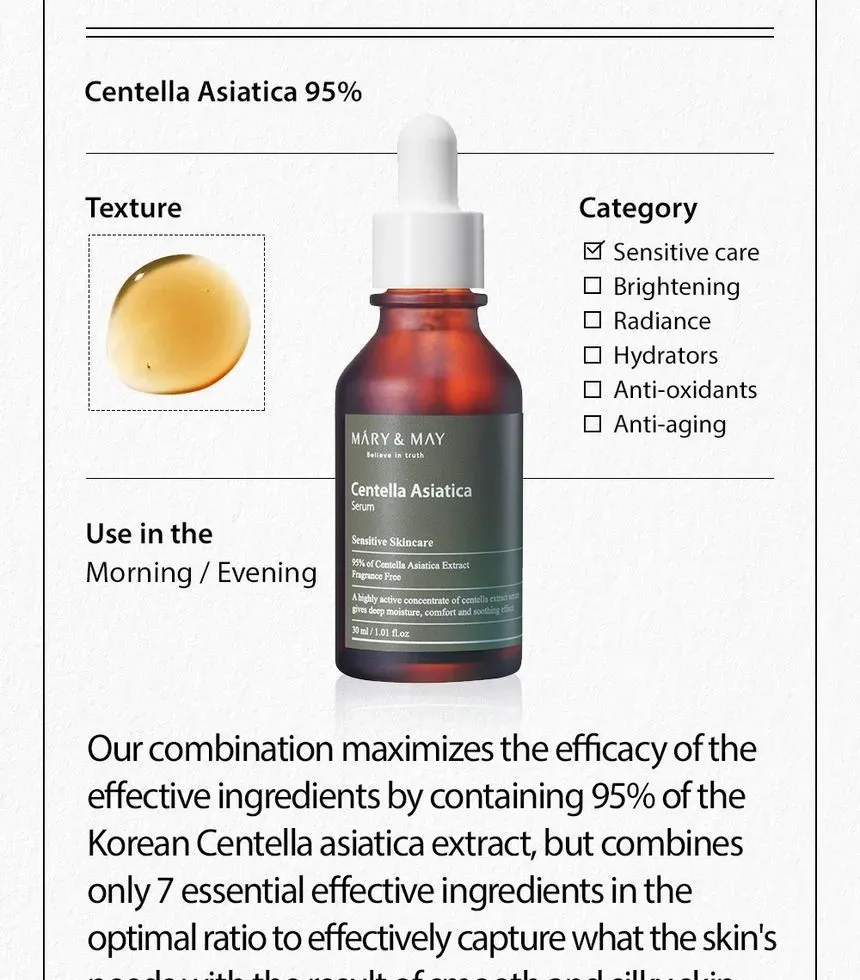 • A fast-absorbing serum that contains 95% Centella Asiatic Extract to instantly sooth irritated sensitive skin without feeling sticky on the skin.