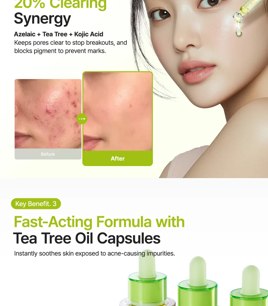 - 20% active formula, including Azelaic, Tea Tree, and Kojic Acid, helps breakout control and post-acne correction.