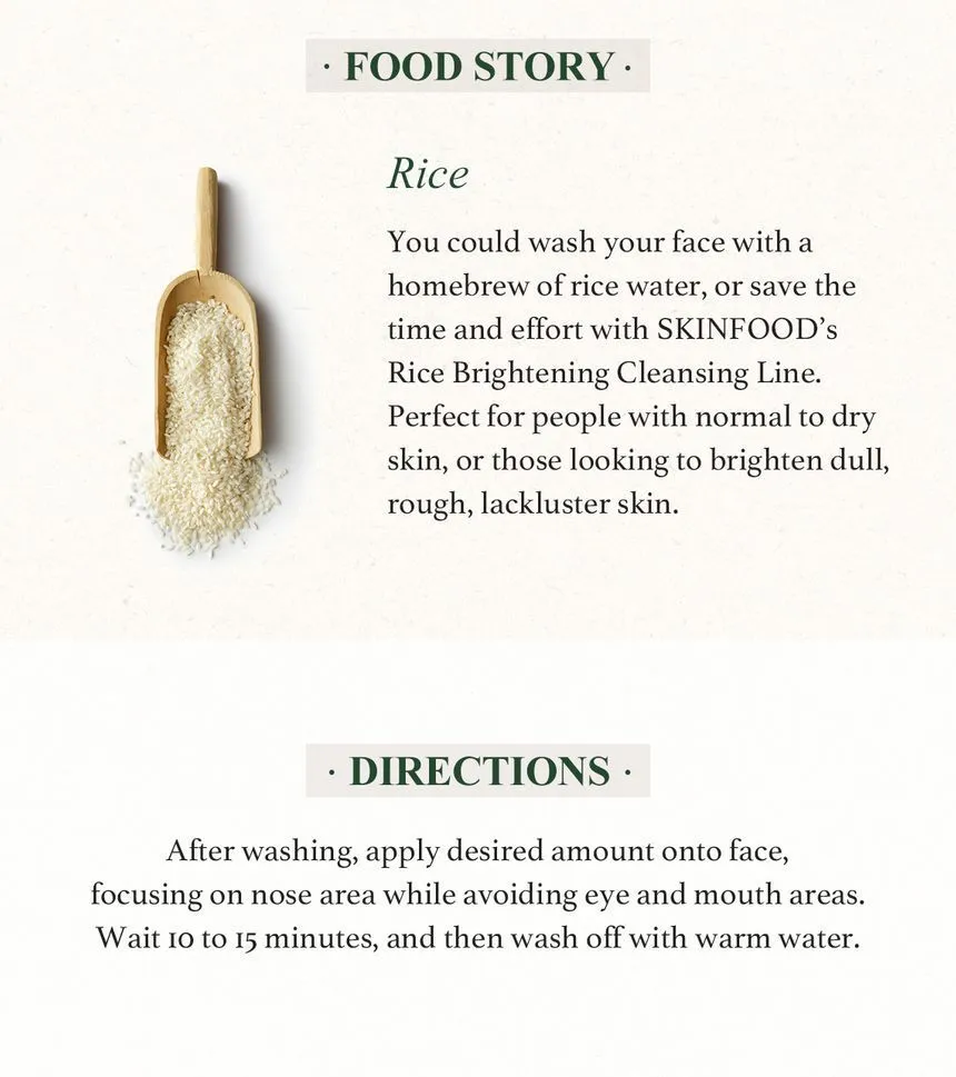 - This wash-off mask pack is part of SKINFOOD’s brightening line which contains rich rice water to fight signs of aging.