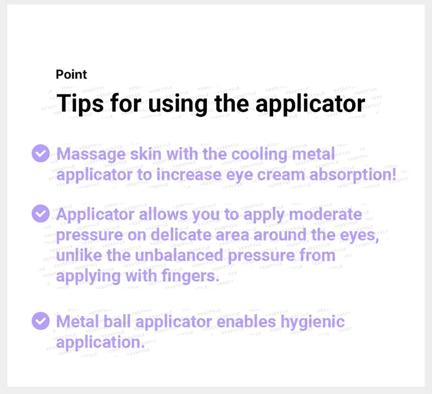 • Apply a moderate amount of eye cream on the desired area with the massage ball applicator. Gently roll along the skin with wrinkles and then tap for better absorption.