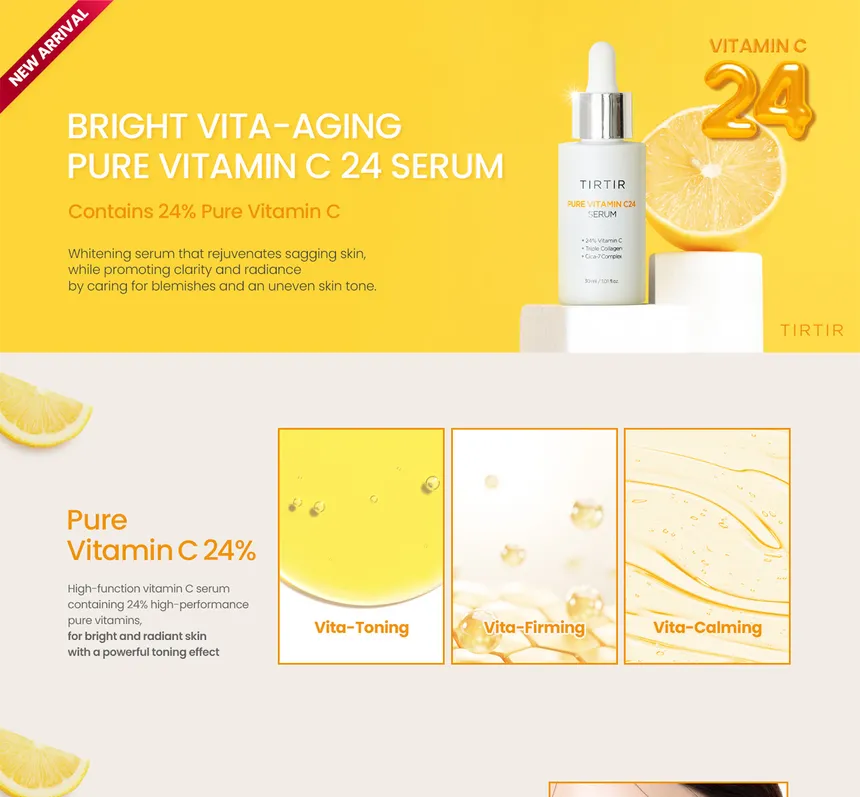 - High-function vitamin C serum containing 24% high-performance pure vitamins for bright and radiant skin with a powerful toning effect.